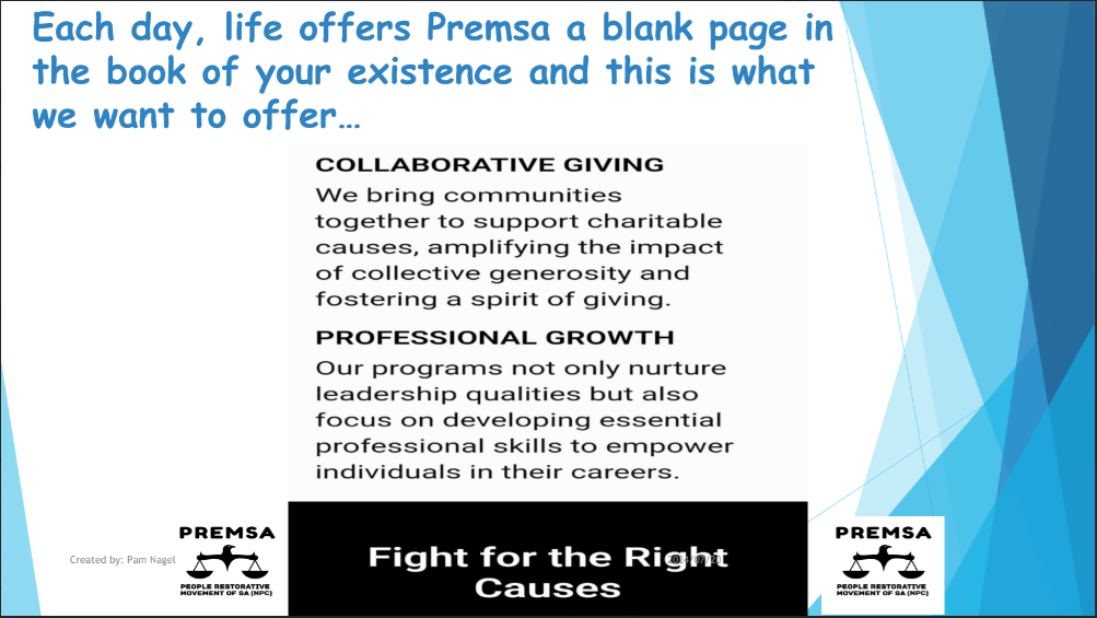 At People Restorative Movement of South Africa (PremSA), we are dedicated to uplifting communities by creating opportunities for the underprivileged. Our mission is to empower aspiring entrepreneurs and existing businesses, particularly those from disadvantaged backgrounds, by providing access to vital funding solutions. We strive to unlock growth potential, foster innovation, and drive sustainable economic development across South Africa.